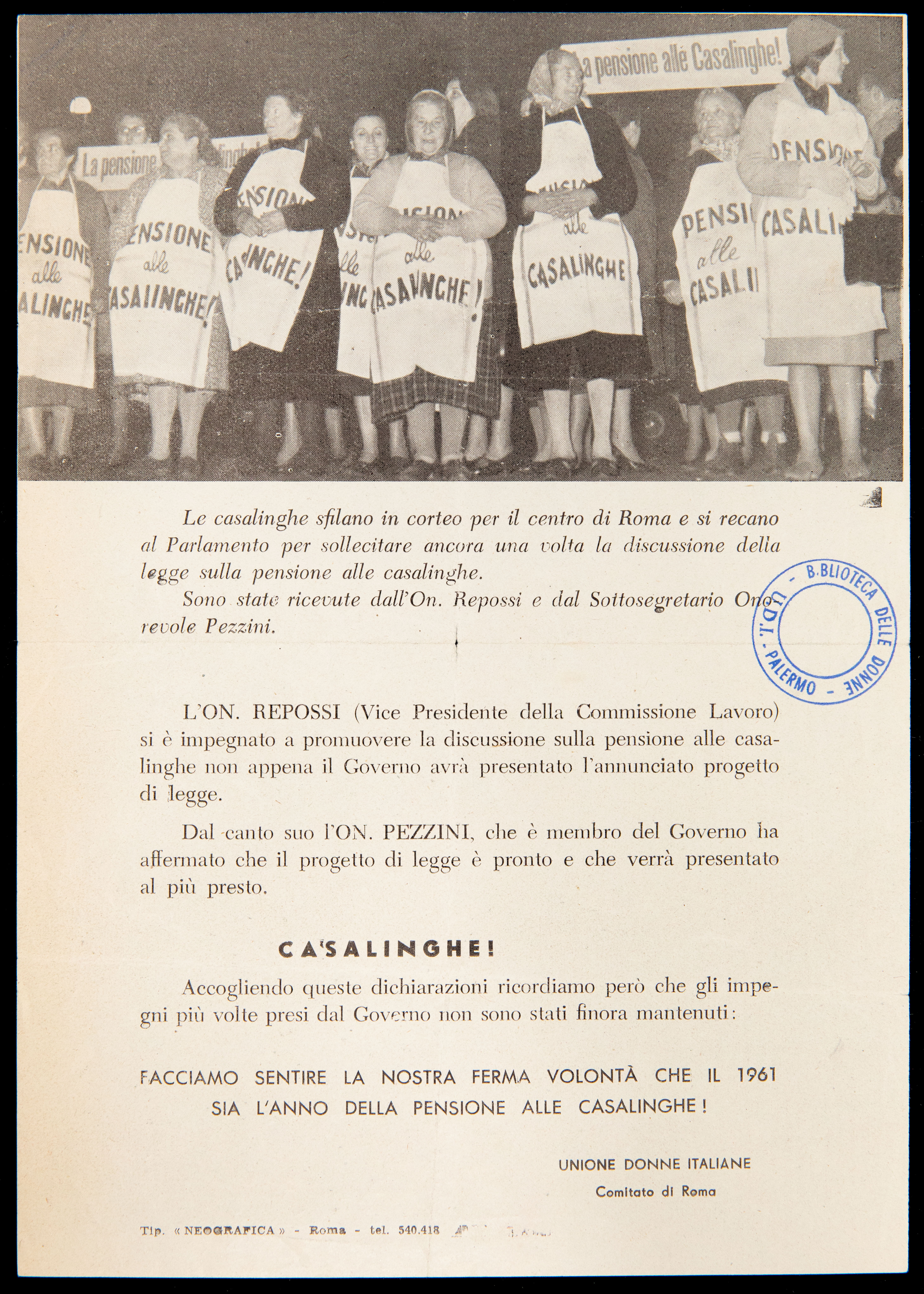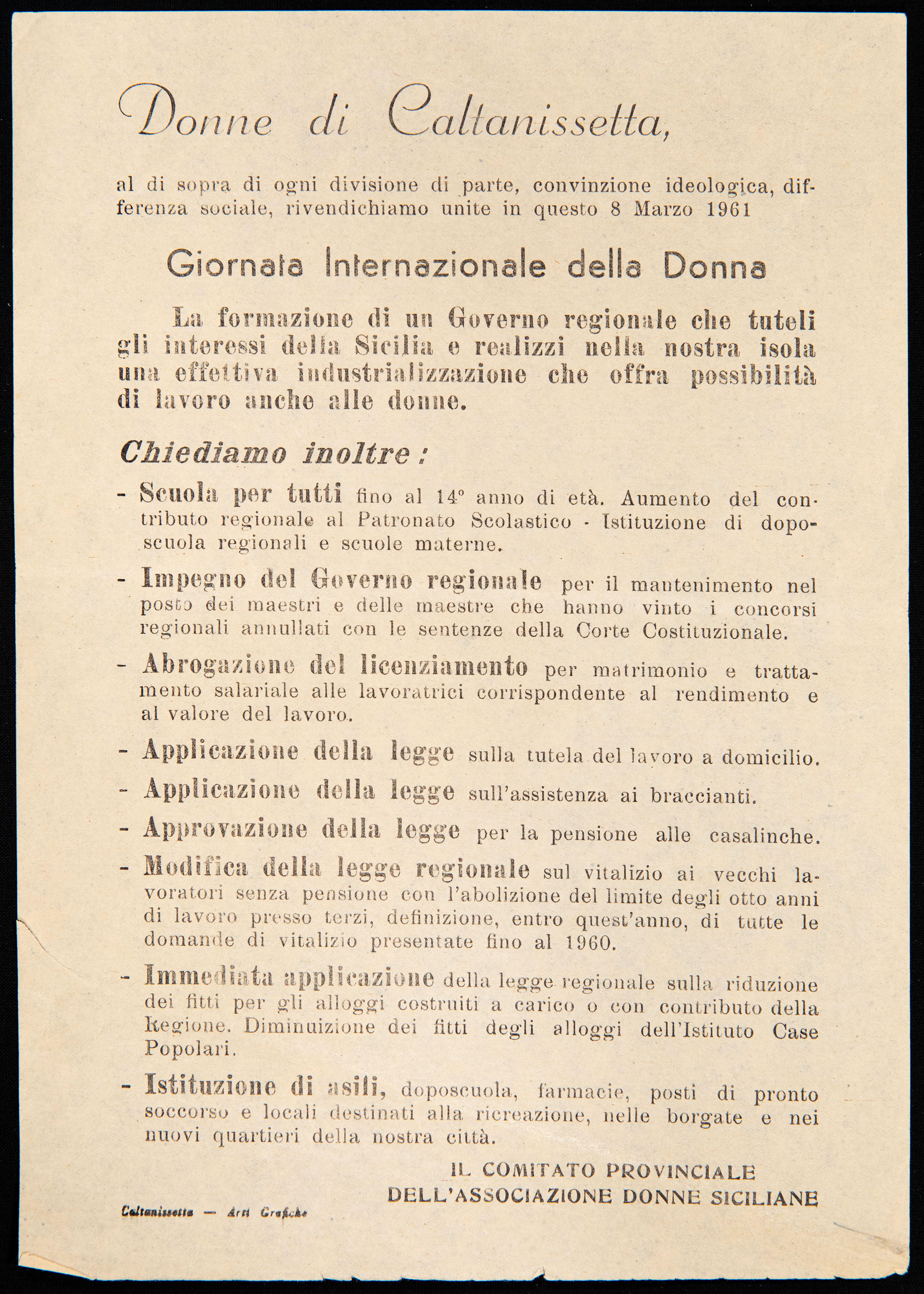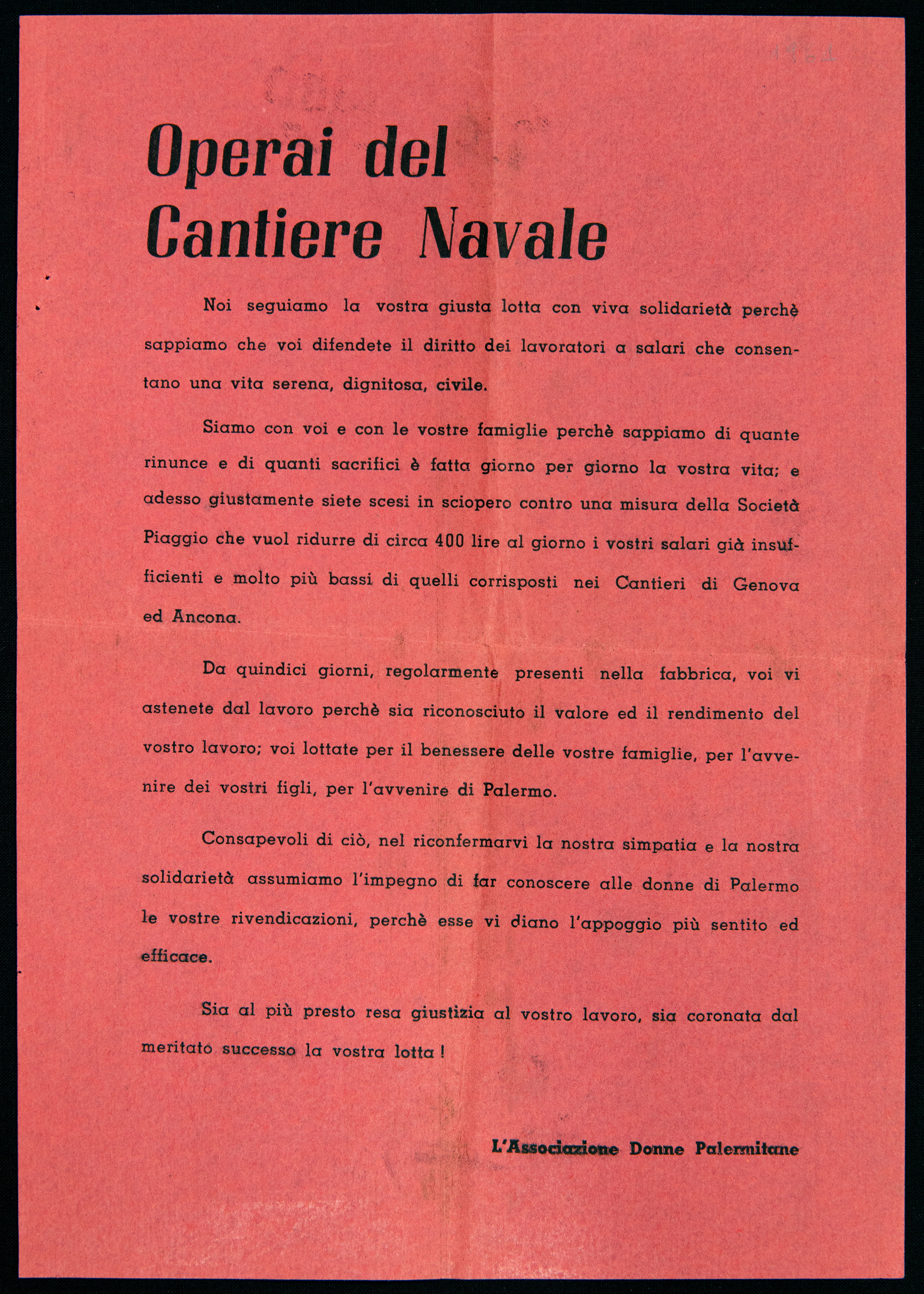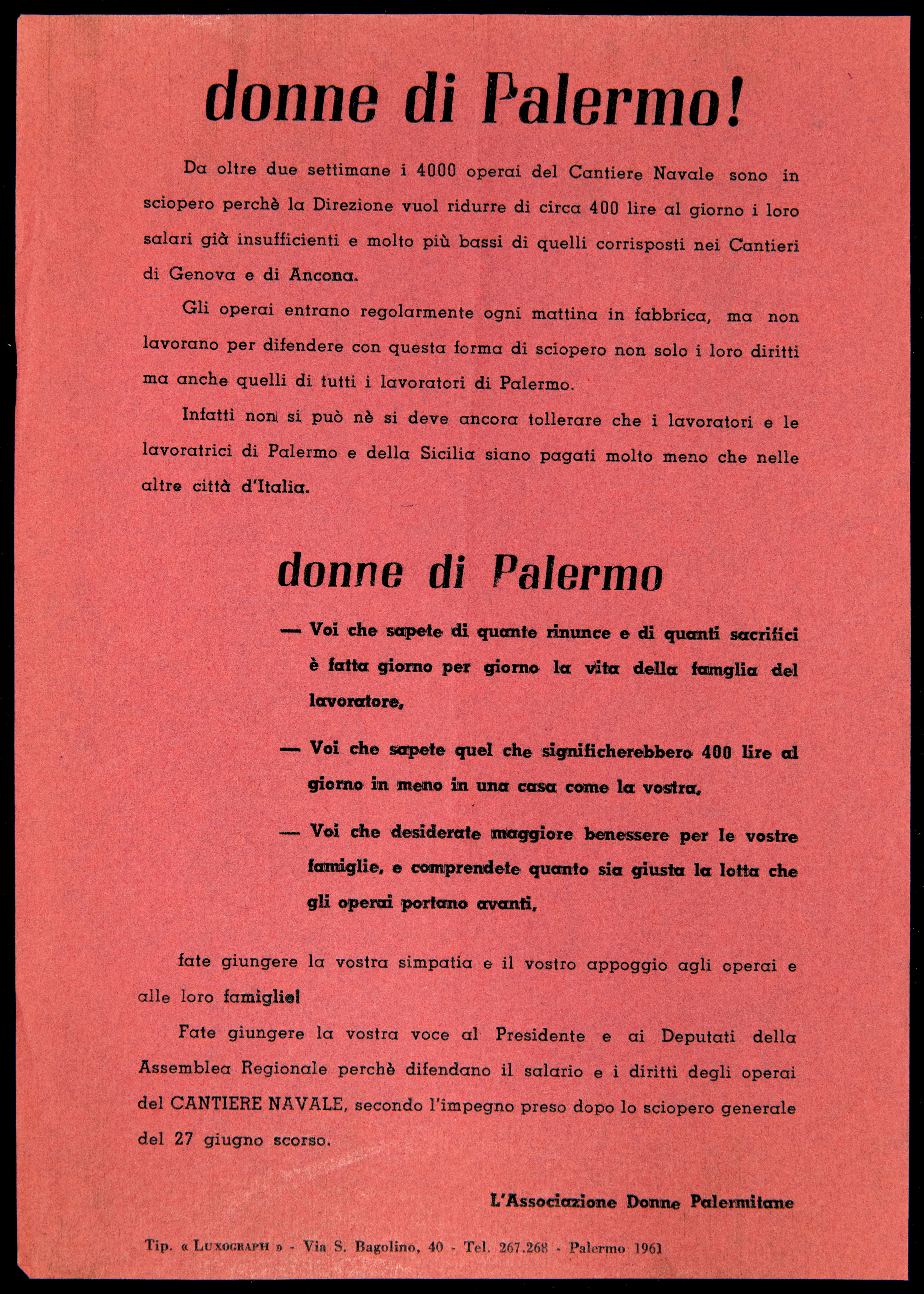 Archivio iconografico Delitto contro l'umanità 1960 Operai del Cantiere Navale s.d. [1961] Donne di Caltanissetta 1961 Casalinghe s.d. [1961] Palermo è la sola città d'Italia che ancora non ha l'amministratore comunale 1961 Donne di Palermo 1961 Sciopero nazionale dei braccianti e compartecipanti analisi storica analisi tecnico-formale s.d. [1961] Dibattito sul disarmo s.d. [1961] Incontro sulla parità di retribuzione analisi storica 1961 Giornata nazionale delle casalinghe 1963 prima pagina 2 3 ultima pagina