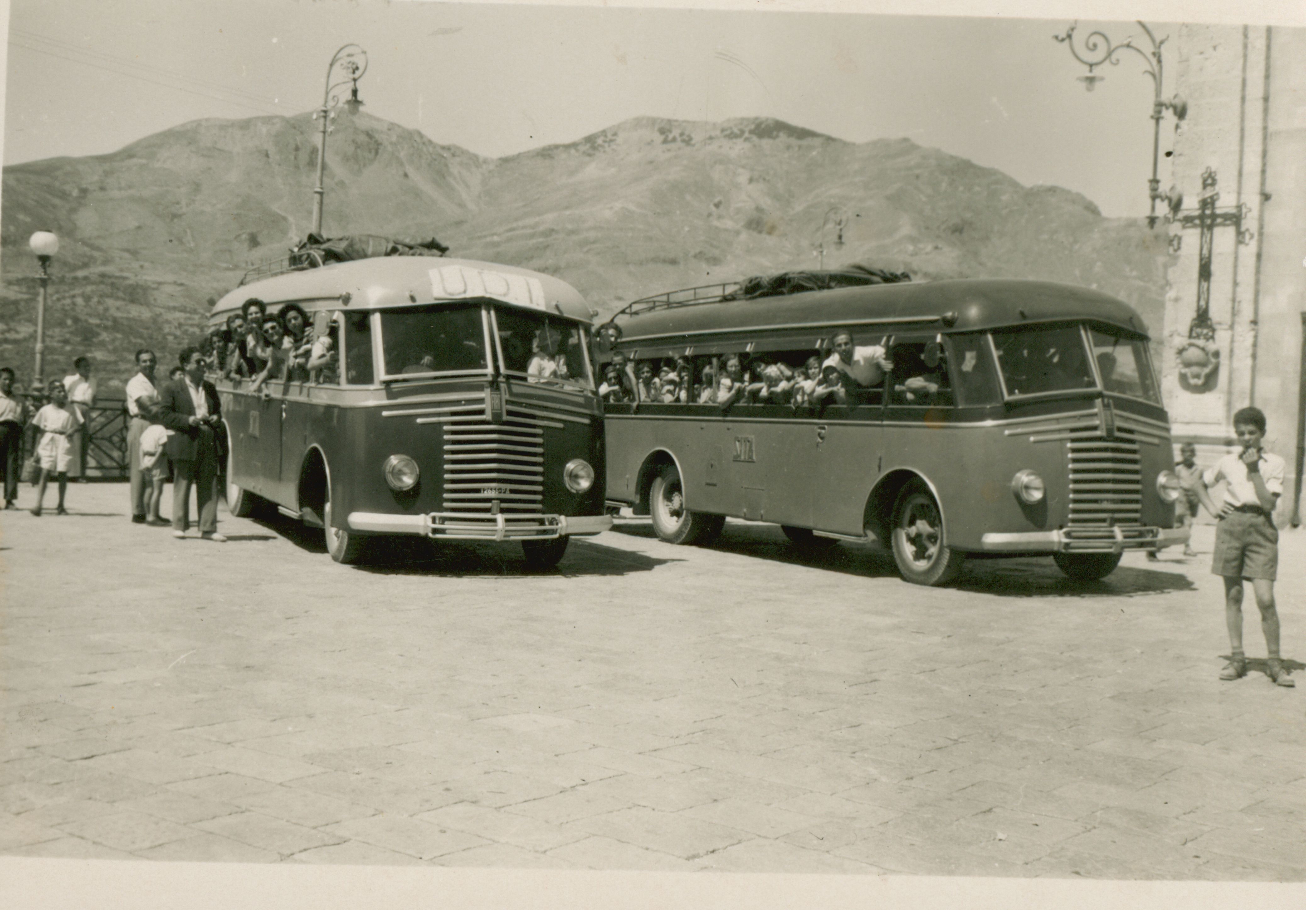 Due autobus con gruppo di bambini, genitori e insegnanti in partenza da Petralia Sottana. stampa ai pigmenti/carta ; 13x18