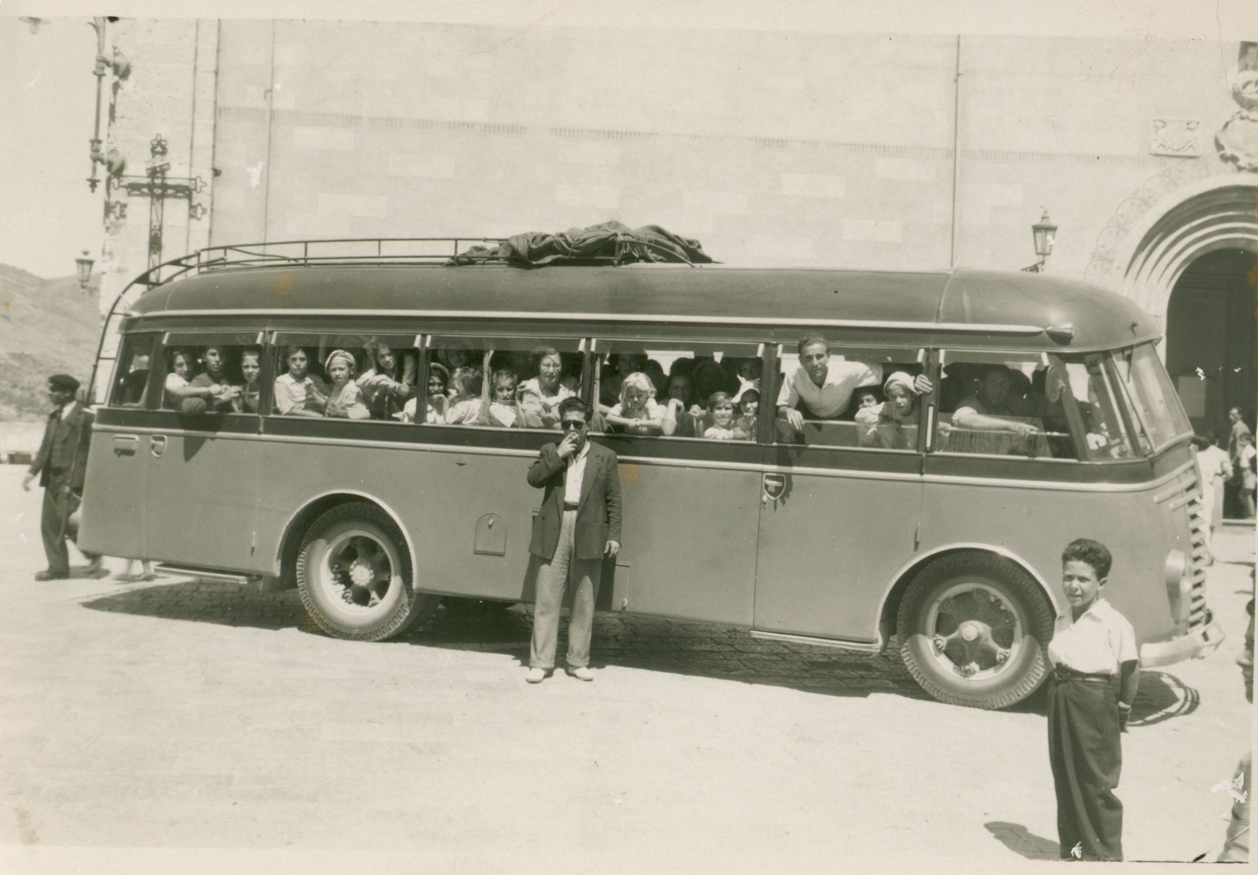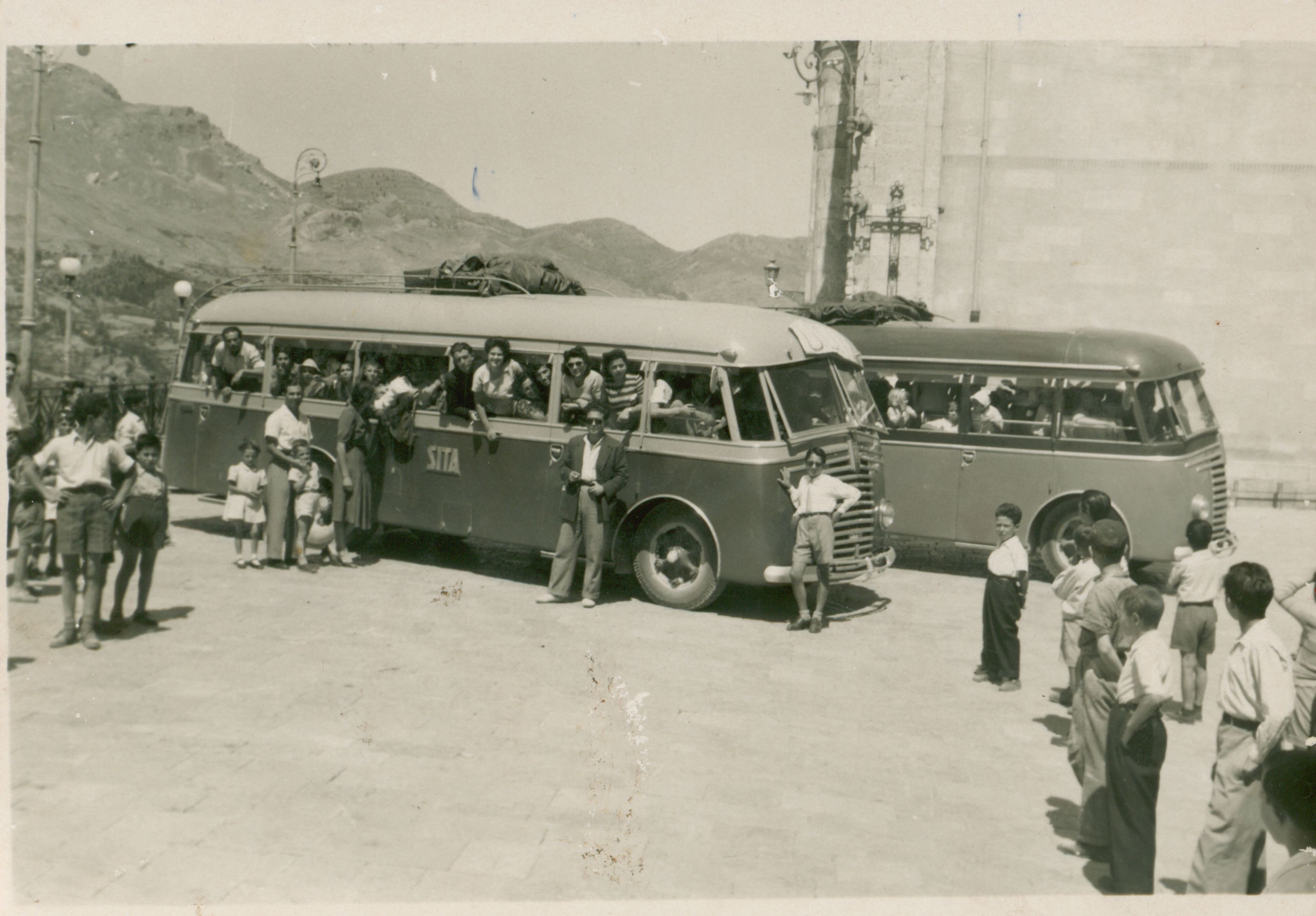 Autobus con gruppo di bambini e insegnanti in partenza da Petralia Sottana.
