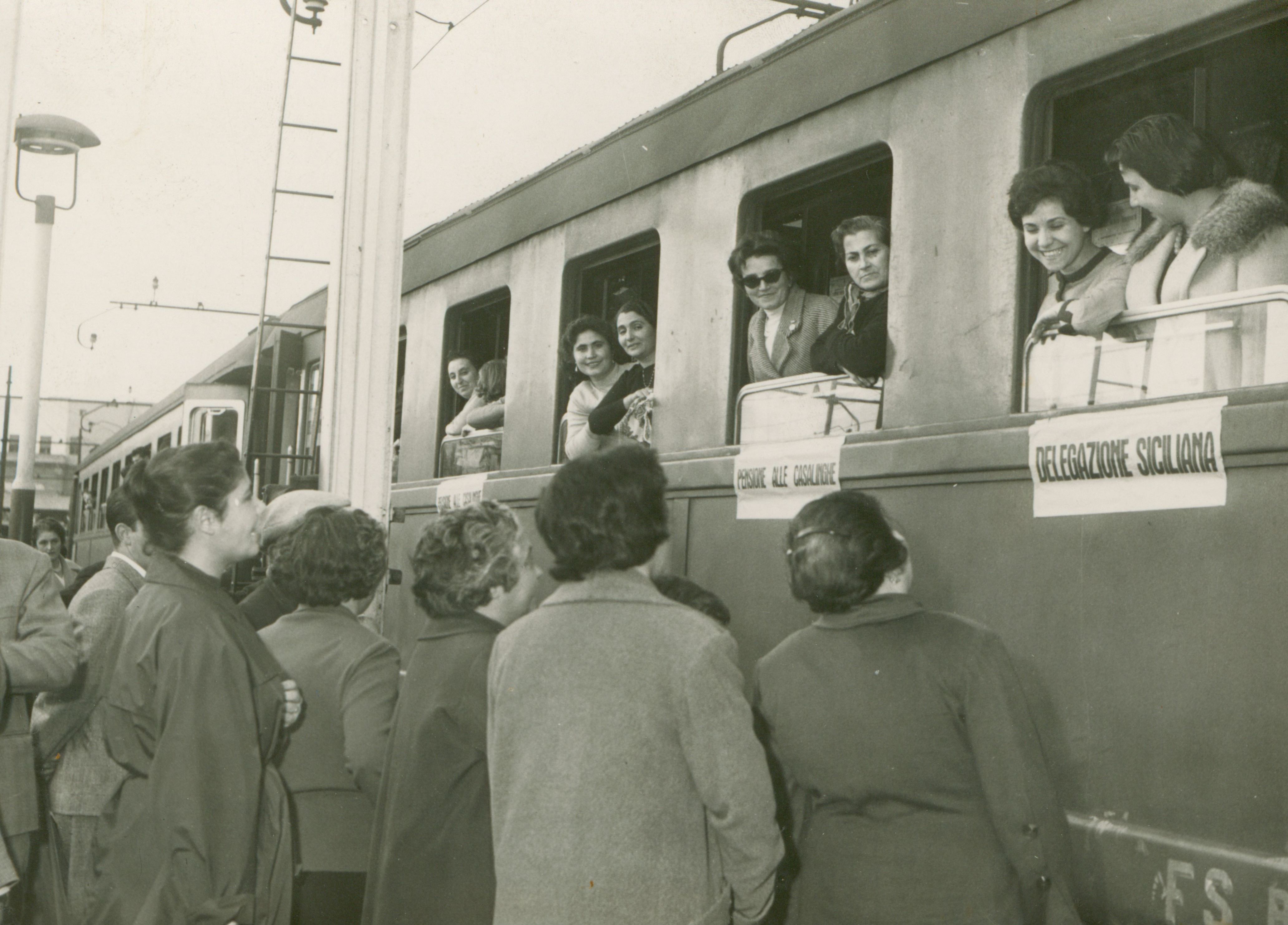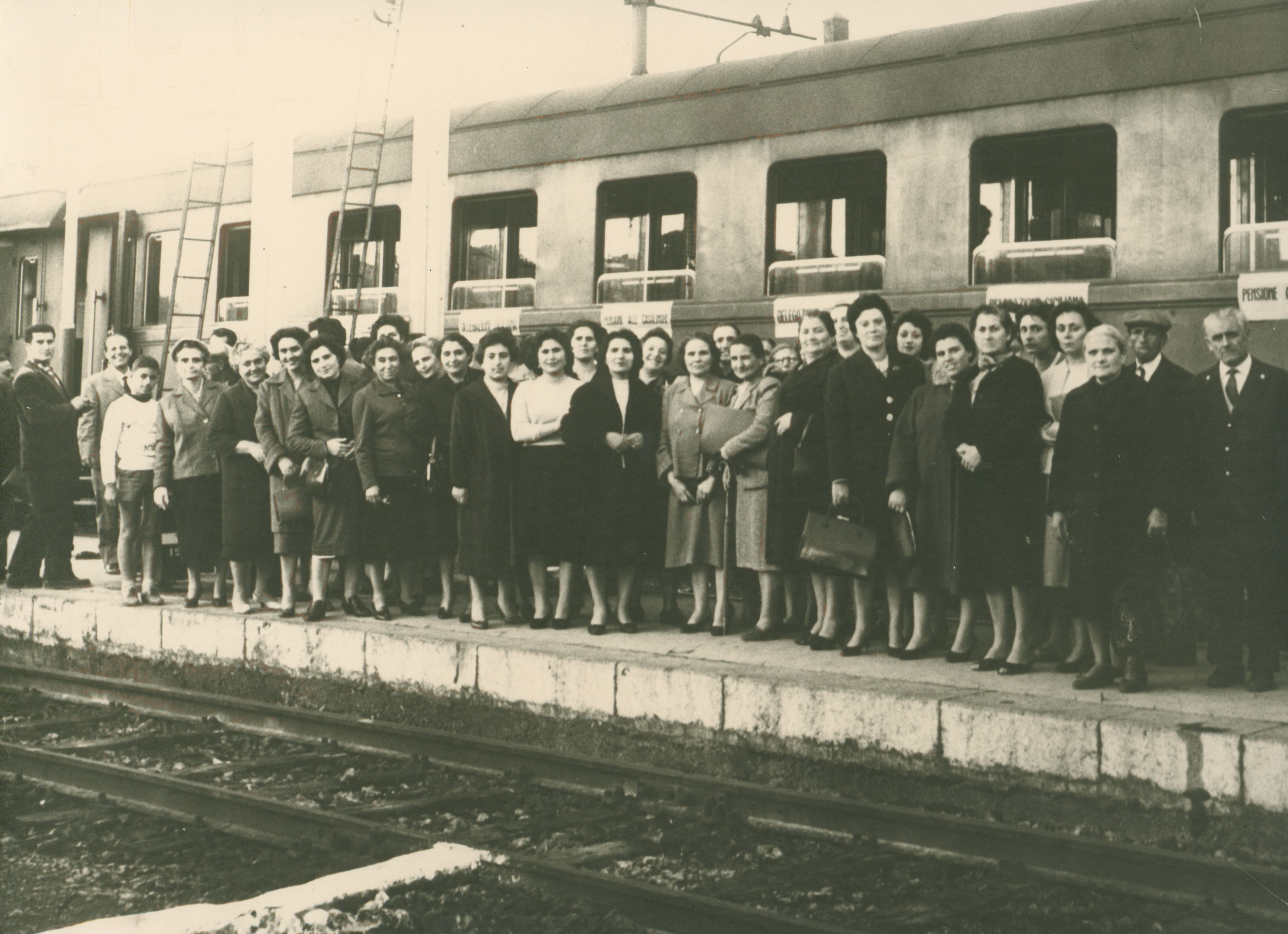 Delegazione delle donne siciliane davanti al treno in partenza per l'Assemblea nazionale per la pensione alle casalinghe. È presente anche Anna Nicolosi Grasso.